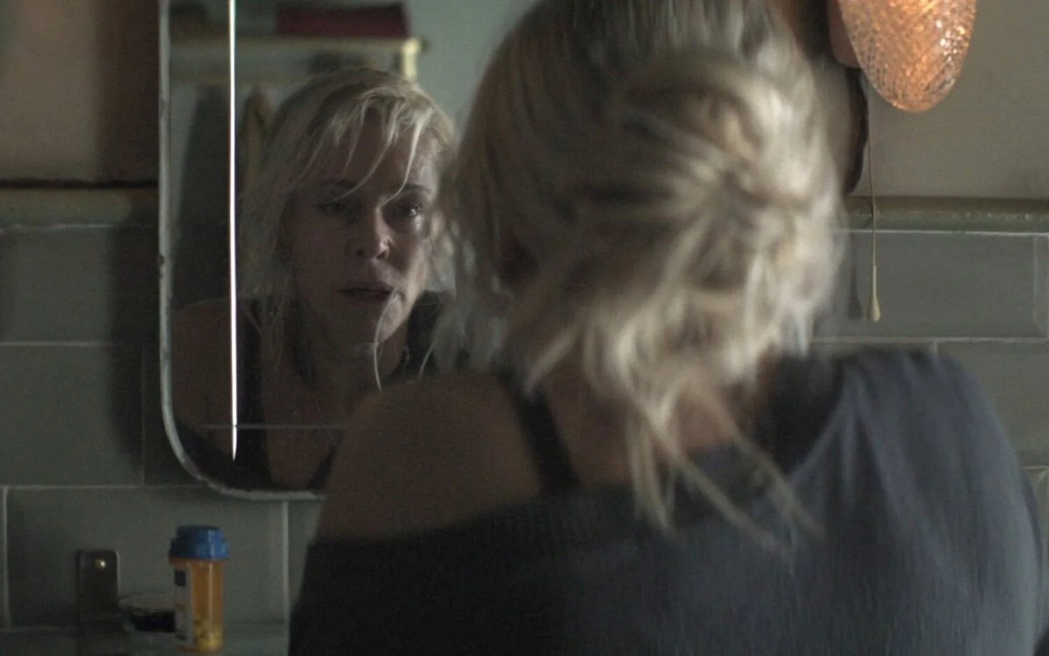 Mira lentamente a su alrededor y se levanta para comprobar cómo está Carla, atravesando el mismo pasillo oscuro del principio de la escena. Se relaja cuando ve que su hija está durmiendo, pero la sorprende otro nuevo tintineo de luces, ahora proveniente del baño.