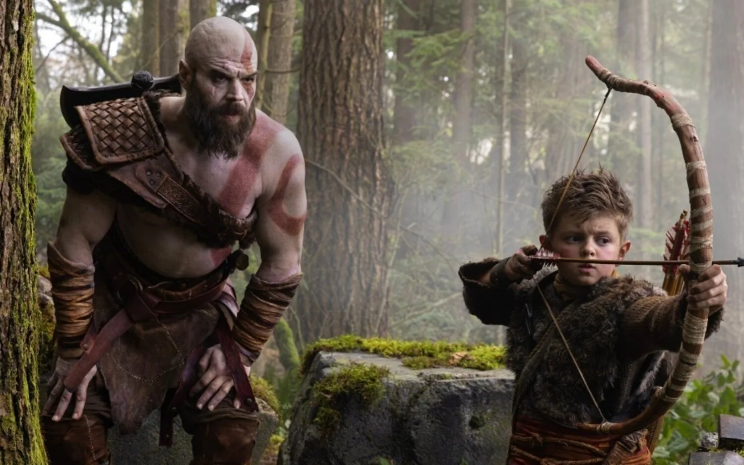 Como sabemos, ‘God of War’ se centrará en la relación paterno-filial entre el guerrero Kratos, interpretado por Ryan Hurst, y su hijo Atreus, encarnado por el joven actor Callum Vinson. En la primera instantánea de la serie los vemos a ambos vestidos con pieles y a Kratos con las líneas rojas habituales marcando su todo su cuerpo. Kratos parece estar enseñando al pequeño Atreus a disparar con arco en lo que podría ser un bosque nórdico, típico de la fotografía del juego.